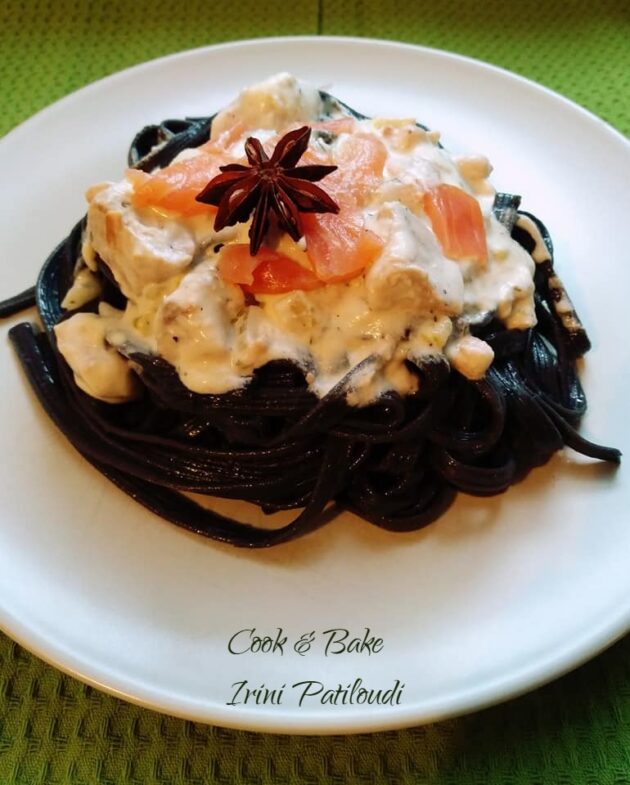 Linguine μαύρα με καπνιστό σολoμό