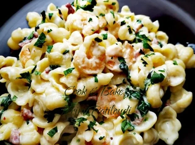 Κοχύλια με σκορδάτες γαρίδες και μπέικον