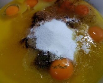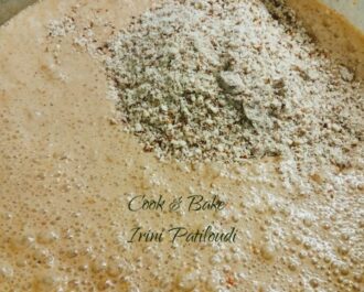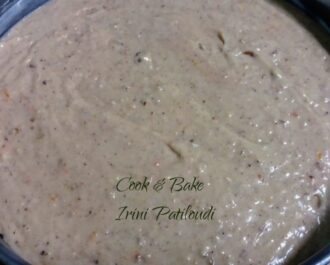 Αν γίνει σφιχτό (πρέπει να είναι σαν την ζύμη του κέικ) προσθέτουμε λίγο χυμό ή γάλα.