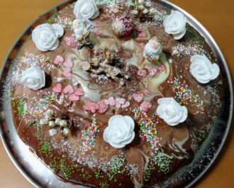Αν θέλουμε πασπαλίζουμε μόνο με ζάχαρη άχνη. Για ντεκόρ με σοκολάτα θα λιώσουμε 150γρ σοκολάτα κουβερτούρα με 2 κουταλιές σούπας ηλιέλαιο και θα ανακατέψουμε πολύ καλά μέχρι να δέσει καλά.