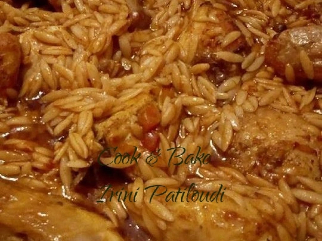 Σε κατσαρόλα βάζουμε λάδι και δυο φλιτζάνια κριθαράκι. Το σοτάρουμε. Κατόπιν ρίχνουμε δυο ντομάτες τριμμένες, πελτέ η χυμό ντομάτας, αλάτι, πιπέρι, μπαχάρι, ξύλο κανέλας, 3 γαρύφαλλα και 6 φλιτζάνια νερό. Βάζουμε στο ταψί την ντομάτα και τα υπόλοιπα, εκτός από το κοτόπουλο και το κριθαράκι και βάζουμε στο φούρνο .Μόλις πάρει βράση ρίχνουμε το κριθαράκι στο ταψί για 10 λεπτά. Ανοίγουμε τον φούρνο και ανακατεύουμε λίγο και προσθέτουμε και το κοτόπουλο.