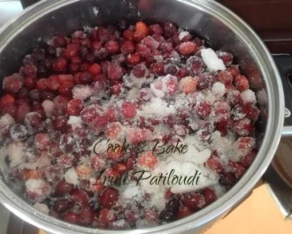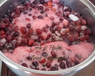 • Βάζουμε τη ζάχαρη από πάνω και αφήνουμε όλη νύχτα να βγούνε τα ζουμιά από τα κράνα μας.