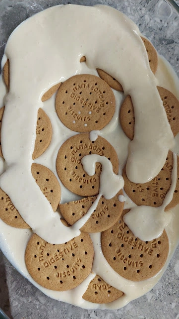 Στρώνουμε εναλλάξ λίγη κρέμα, μία στρώση μπισκότα , πάλι κρέμα , πάλι μπισκότα κλπ. Εμένα μου πήρε 3 στρώσεις μπισκότα και 4 στρώσεις κρέμα.