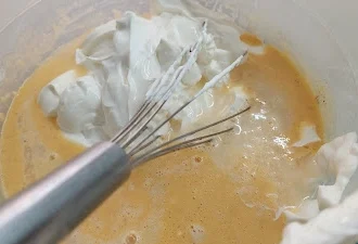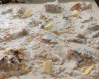 Απλώνουμε από πάνω την κρέμα, ανακατεύουμε απαλά να πάει ως κάτω και κόβουμε κομματάκια το βούτυρο από πάνω.