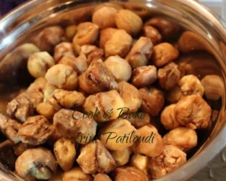 Πλένουμε τα κάστανα και τα βράζουμε με το νερό και το αλάτι για 30 λεπτά και τα σουρώνουμε.