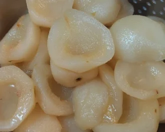 Περιχύνουμε με το σιροπάκι από τα βρασμένα αχλάδια.