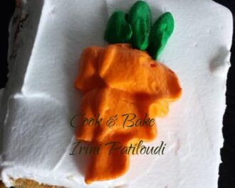 Για την λευκή επικάλυψη. Φυτική κρέμα χτυπημένη σε σαντιγί Μετά χωρίζουμε από 1 κουταλιά και βάζουμε αντίστοιχα λίγο χρώμα πράσινο και πορτοκάλι. Με μια σακούλα του κορνέ και με μύτη κάνουμε τα καρότα.
