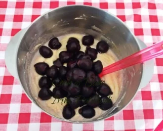 Κόβουμε αν θέλουμε τα κεράσια στη μέση, τα ρίχνουμε μέσα στον κάδο και με μία μαρίζ τα ανακατεύουμε καλά να πάνε τα κερασάκια μας παντού.