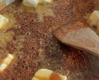 Μόλις δούμε ότι λιώνει το βούτυρο ξαναβάζουμε σε χαμηλή φωτιά να δέσει και να πάρει μία βράση ανακατεύοντας συνέχεια. Βάζουμε ξεσκέπαστη την κατσαρόλα στην άκρη.