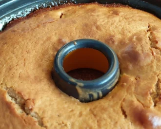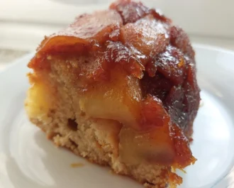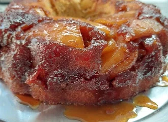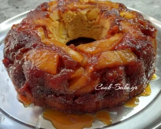 Όσο είναι ακόμη ζεστό το αναποδογυρίζουμε σε πιατέλα στρόγγυλη.