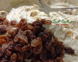 Προσθέτουμε τα μήλα και τις σταφίδες και ανακατεύουμε απαλά να πάνε παντού.