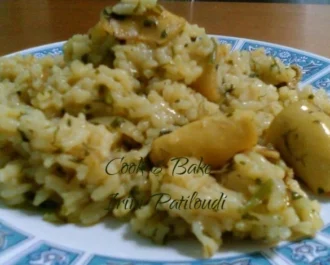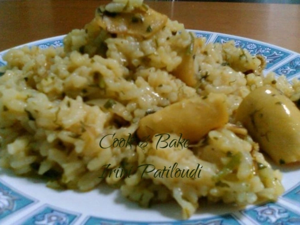 Προσθέτουμε 1 φλιτζάνι ρύζι κίτρινο αμερικής η καρολίνα και σε πιο χαμηλή φωτιά αφήνουμε να βράσει για 15 λεπτά, ίσως χρειαστεί λίγο νεράκι ακόμα να δέσει λίγο το ρύζι μας και σερβίρουμε.