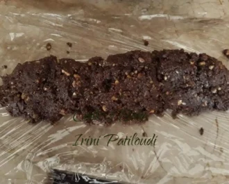 • Πιέζουμε έπειτα το μείγμα ώσπου να σφίξει το τοποθετούμε σε μεμβράνη. Με τα χέρια μας του δίνουμε σχήμα σαν σαλάμι και το τυλίγουμε στη μεμβράνη, σφιχτά. Το αφήνουμε 2 - 3 ώρες στο ψυγείο.