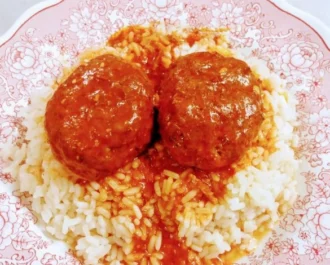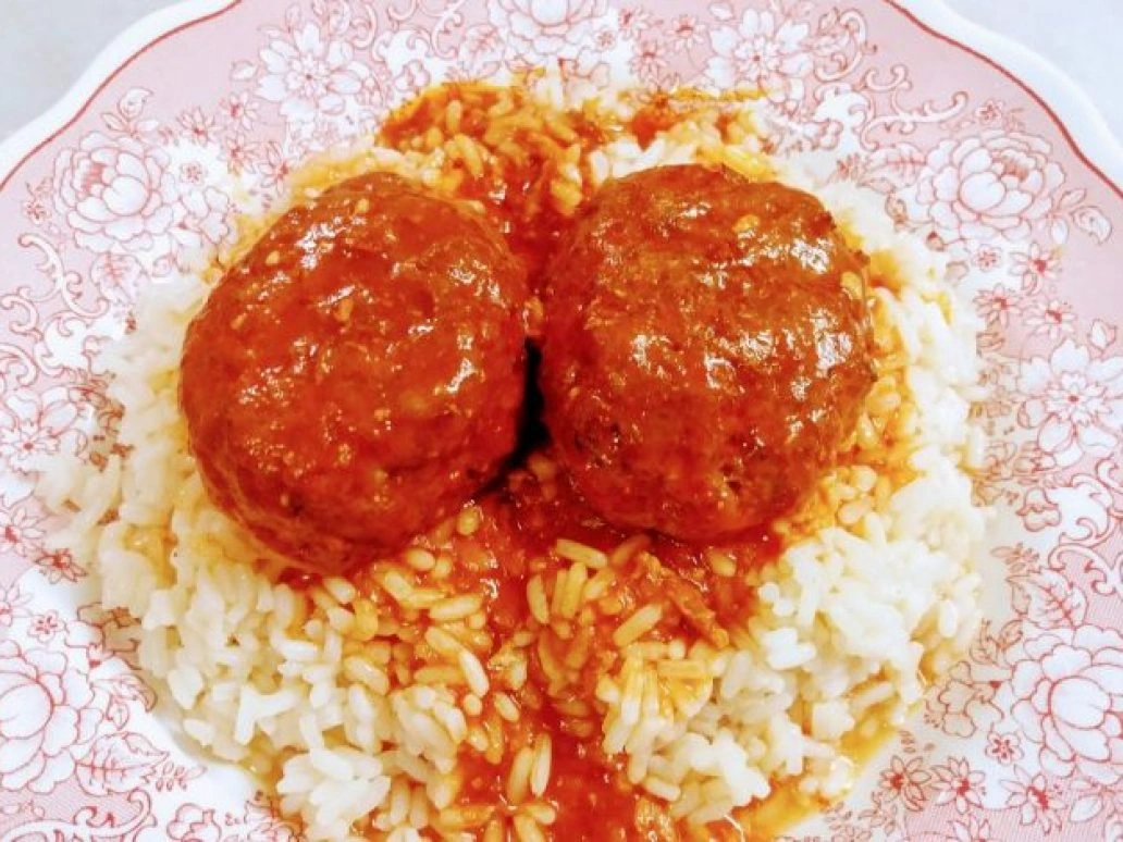 Κεφτέδες με ρύζι και σάλτσα ντομάτας.