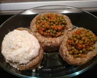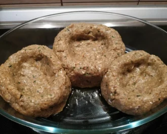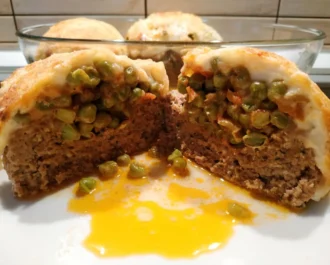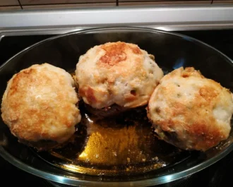 Ζυμώνουμε τον κιμά, πλάθουμε σε μεγάλα μπαλάκια και τα τοποθετούμε σε λαδωμένο ταψί. Κάνουμε ένα βαθούλωμα για την γέμιση.