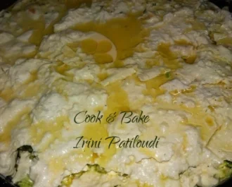 Σκεπάζουμε με τα δύο τελευταία φύλλα μας που βρέξαμε πάλι λίγο κάτω από την βρύση και λαδώσαμε ελαφρά, περιχύνουμε με το αυγό-γάλα και δύο κουταλιές ελαιόλαδο. Αφήνουμε 10 λεπτά να τραβήξει.