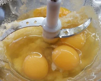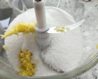 Σε μπλέντερ η μούλτι ή μίχερ χειρός χτυπάμε να ανακατευτεί το ξύσμα με την ζάχαρη για να αναδειχθεί περισσότερο το άρωμα του λεμονιού,