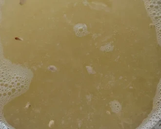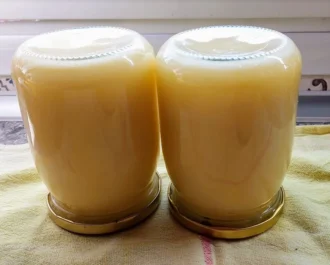 Ανακατεύουμε που και που να μην είναι τόσο ζεστή η κρέμα μας, την περνάμε από μεγάλη σίτα να μείνει καθαρή και βελούδινη. Αδειάζουμε στο αποστειρωμένο βάζο μας ή στα βάζα.