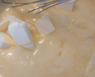Προσθέτουμε το βούτυρο και ανακατεύουμε μέχρι να λιώσει και ενσωματωθεί με την κρέμα. Αποσύρουμε από την φωτιά .