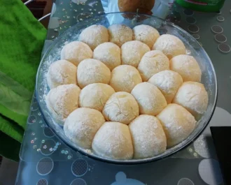 Η ζύμη, πρέπει να βγει περίπου 880γρ. Ζυγίζουμε μπαλάκια 40 γρ., τα βάζουμε σε μια πιατέλα με αλεύρι. Αφήνουμε να ξεκουραστούν 15 λεπτά.