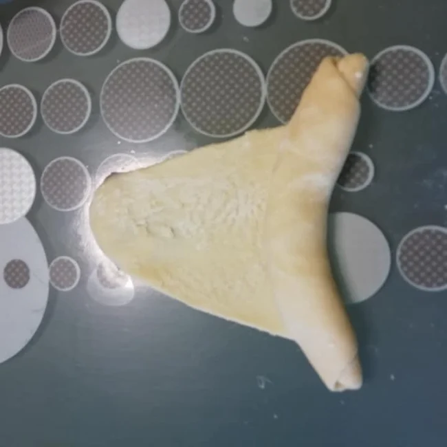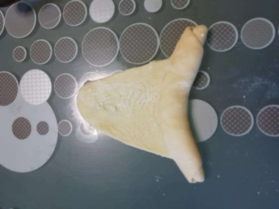 Απλώνουμε κάθε μπαλάκι (δεν βάζουμε αλεύρι στο τραπέζι) όπως το βλέπετε στην φωτογραφία, στην άκρη βάζουμε μια μικρή κουταλιά βούτυρο-ζάχαρη (χώρισα σε ποσότητες, ίσα ίσα να βγει για 22 κρουασάν) και αρχίζουμε να τυλίγουμε ένα ένα ώσπου να ανοίξει από την μία, από την άλλη φτιάχνοντας κρουασάν.