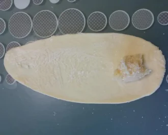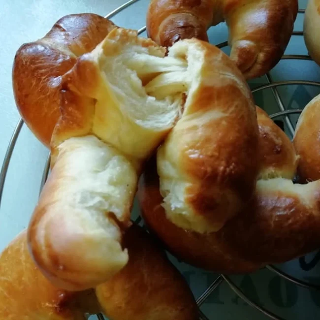 Σε ένα ταψί στρόγγυλο ρίχνουμε αυτό το μείγμα. Στην άκρη, βάζουμε 7γρ αλάτι και 25 γρ ζάχαρη. Στη μέση, βάζουμε 20 γρ φρέσκια μαγιά, 220 ml κρύο γάλα και 70 γρ αβγό χτυπημένο. Σιγά σιγά, ανακατεύουμε με το αλεύρι αφήνοντας το αλάτι και τη ζάχαρη στο τέλος και ζυμώνουμε.
