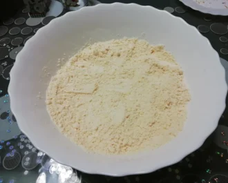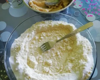 Σε μια λεκάνη, ανακατεύουμε 400 γρ αλεύρι με 80 γρ βούτυρο. Πρέπει να γίνει σαν άμμος.