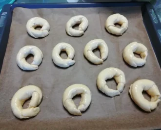 Βάζουμε τα 11 πρώτα κρουασάν σε χαρτί ψησίματος για 13 λεπτά στους 180 βαθμούς.