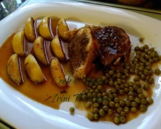 Για της πατάτες, της καθαρίζουμε, της πλένουμε, βάζουμε πιπέρι και αλάτι. Σε ένα τηγάνι, λιώνουμε βούτυρο και τσιγαρίζουμε της πατάτες μέχρι να κοκκινίσουν. Βράζουμε τον αρακά και τον περνάμε κι αυτόν από το βούτυρο. Σερβίρουμε τον κόκκορα με τις πατάτες και τον αρακά. Περιχύνουμε με την σάλτσα μας. Καλή απόλαυση!