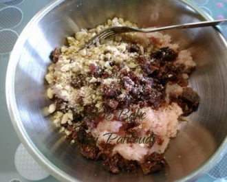 Για τη γέμιση, θέλουμε 5-6 ξερά σύκα, 5-6 καρύδια, 5-6 αμύγδαλα, 1/2 φιλέτο κοτόπουλο, τα αλέθουμε χωριστά και τα βάζουμε σε μια λεκάνι με 1 αυγό, 3 κουταλιάς της σούπας φρυγανιά, αλάτι, πιπέρι και κονιάκ.