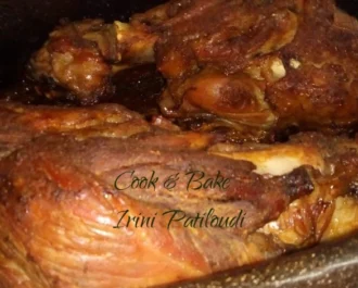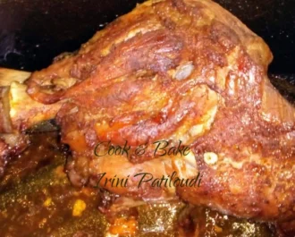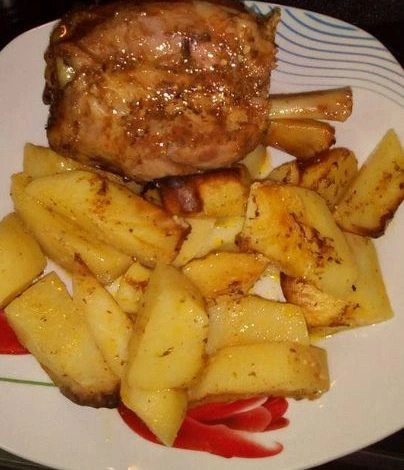 Κότσι χοιρινό με πατάτες στον φούρνο.