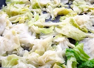 Στρώνουμε το μισό λάχανο στο ταψί.