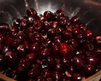 Πλένουμε τα κεράσια καλά και αφαιρούμε κοτσάνια και κουκούτσια