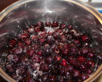 • Τα βάζουμε σε μια βαθιά κατσαρόλα με το νερό και αφήνουμε να πάρουν μια βράση. Στη συνέχεια προσθέτουμε τη ζάχαρη ή τη στέβια και αφού πάρει βράση χαμηλώνουμε τη φωτιά και ξαφρίζουμε αν χρειαστεί.