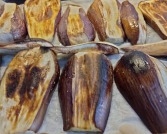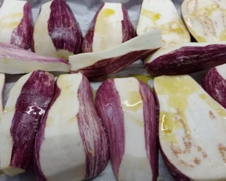 Κόβουμε τις πλυμένες μελιτζάνες μας σε χοντρές φέτες και αραδιάζουμε σε χαρτί ψησίματος με λάδι και αλάτι.