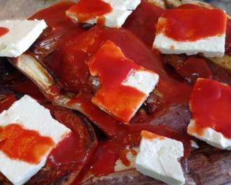 Τέλος παπαλίζουμε με τα τριμμένα τυριά που κρατήσαμε, λάδι, νεράκι, πιπέρι , πάπρικα και βασιλικό.