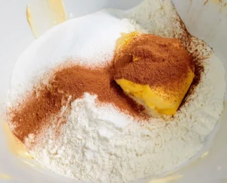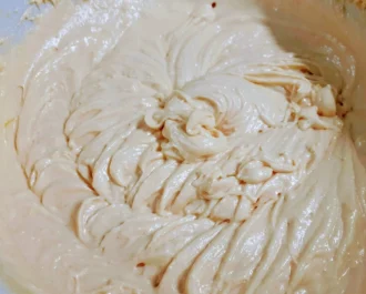 Χτυπάμε όλα τα συστατικά της βάσης , ζύμης μας. Πρώτα το βούτυρο με την ζάχαρη να ασπρίσουν και μετά όλα τ άλλα.