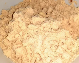 Θα γίνει σαν σκόνη και μετά το ζυμώνουμε λίγο με το χέρι για να γίνει γρομπαλάκια.