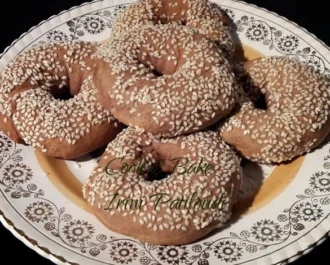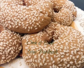 • Αφήνουμε 15 λεπτά τη ζύμη να ξεκουραστεί. Παίρνουμε 50 γρ. ζύμη και πλάθουμε στρογγυλά κουλούρια. Στρώνουμε αντικολλητικό χαρτί στο ταψί και τοποθετούμε επάνω τα κουλούρια (αν θέλουμε τα περνάμε στο σουσάμι), τα σκεπάζουμε με ένα άλλο ταψί και ψήνουμε σε προθερμασμένο φούρνο 150 βαθμούς αέρα για 20 λεπτά. Βγαίνουν περίπου 40 κομμάτια.