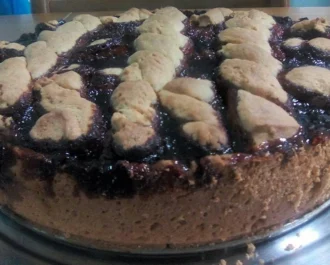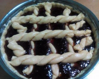 Ζυμώνουμε όλα τα υλικά να γίνει μια μαλακιά ζύμη που να μην κολλάει, Χωρίζουμε στα δύο, τυλίγουμε το πιο μικρό κομμάτι σε σελοφάν και αφήνουμε την ζύμη να κρυώσει στο ψυγείο μισή ώρα περίπου, το υπόλοιπο ζυμάρι το πατάμε σε μια διαιρούμενη φόρμα 28 cm και αδειάζουμε ένα βάζο μαρμελάδα της αρεσκείας μας 500γρ.