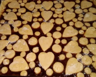 Αφού πάγωσε το ζυμάρι στο σελοφάν κάνουμε κορδόνια και βάζουμε σταυρωτά επάνω στην μαρμελάδα ή κάνουμε ότι άλλο σχέδιο θέλουμε με κουπ πατ, ψήνουμε στον αέρα σε ζεστό φούρνο 175 βαθμούς για 50 λεπτά περίπου.