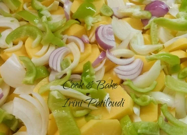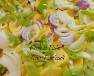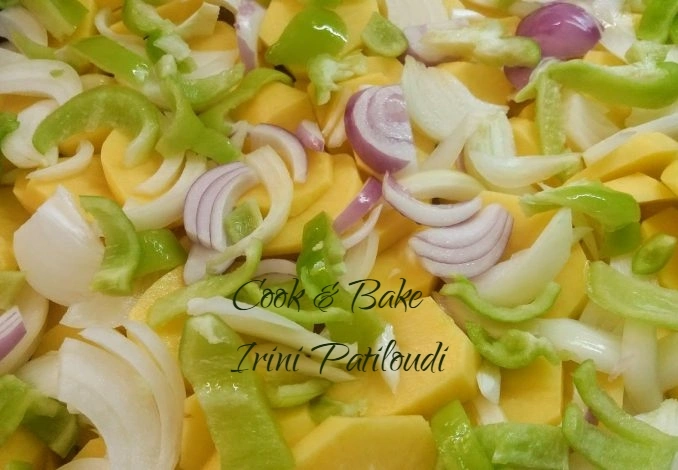 Κόβουμε από πάνω , πατάτες ροδέλες, κρεμμύδια σε φέτες, σκόρδο, πιπεριές .