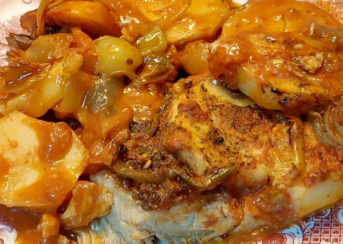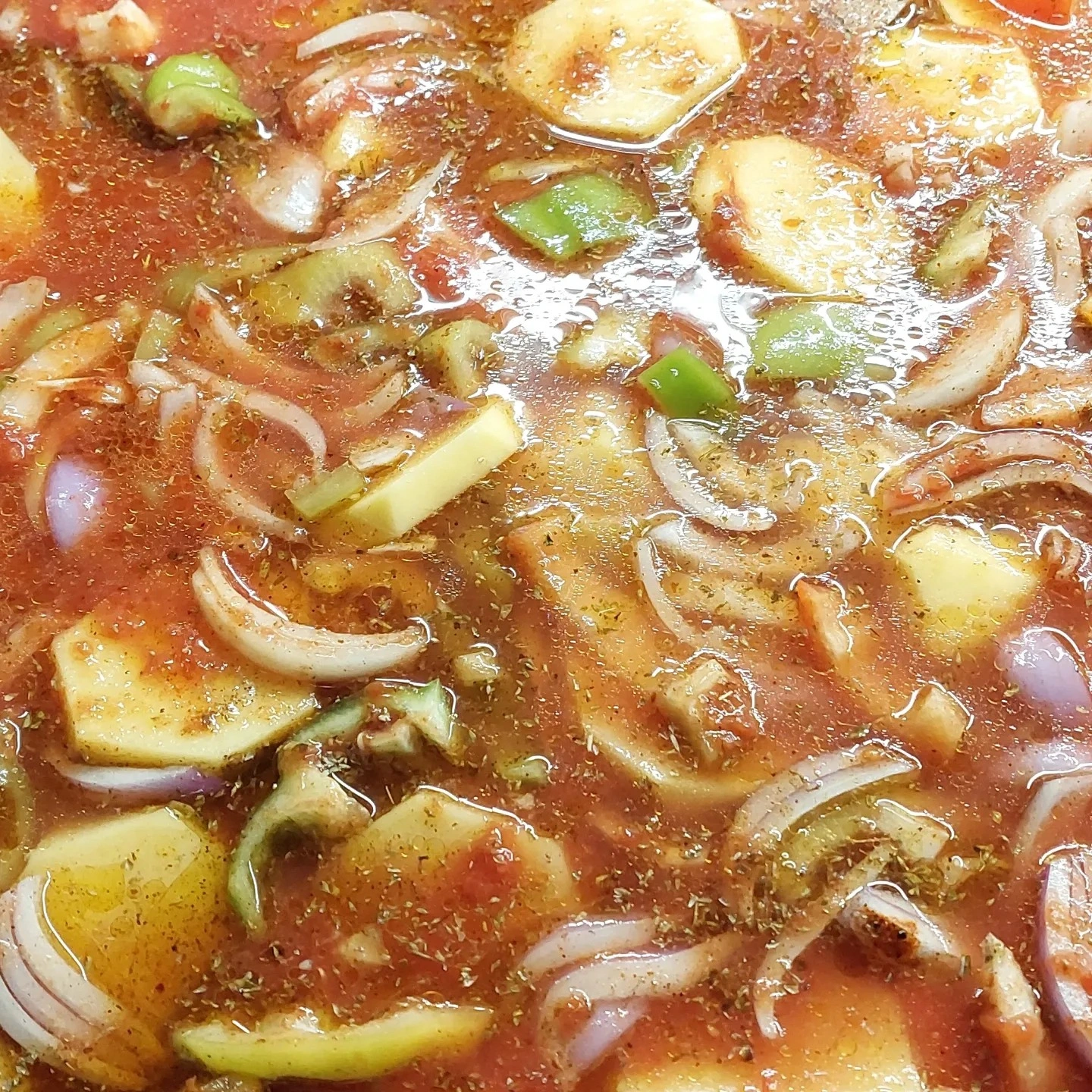 Σκεπασμένο με πατάτες, κρεμμύδια και ντομάτες.