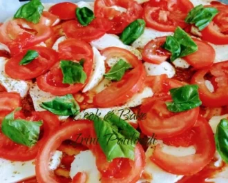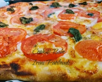 Πίτσα μαργαρίτα με μοτσαρέλα , ντομάτα και βασιλικό.