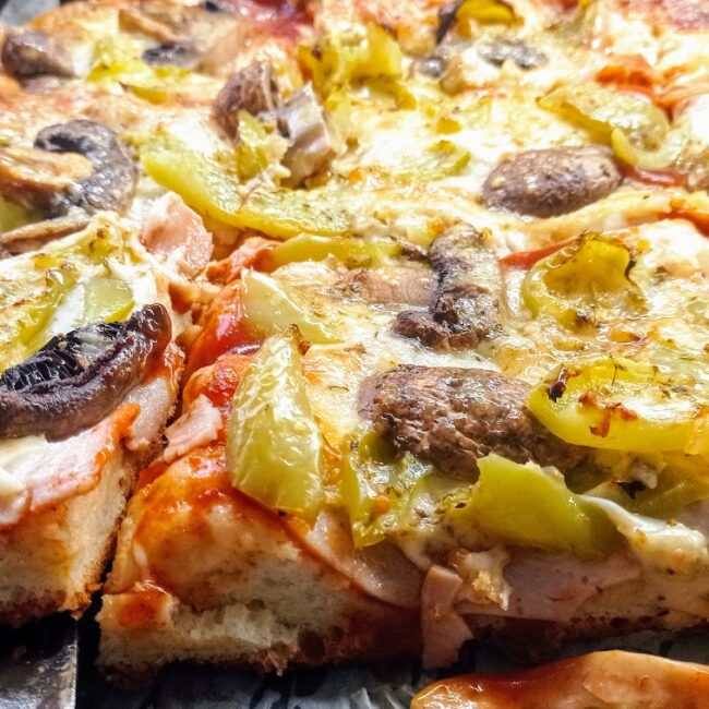 Εδώ με μοτσαρέλα, πιπεριά, μαντάρια, ντομάτα.