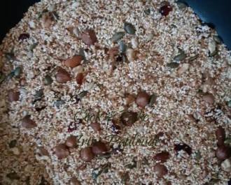 Καβουρντίζουμε το σουσάμι σε ένα φαρδύ τηγάνι μέχρι να πάρει χρώμα. Αδειάζουμε σε ένα σκεύος να κρυώνει και προσθέτουμε και τους ξηρούς καρπούς μας.