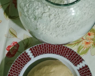 Ζυμώνουμε όλα τα υλικά μαζί. Πρέπει να έχουμε μία ελαστική ζύμη. Την σκεπάζουμε και αφήνουμε να φουσκώσει.