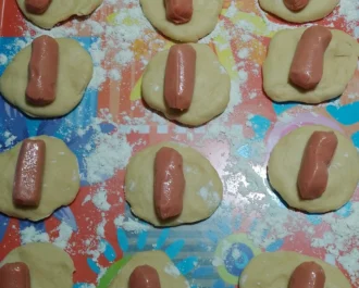 Υπέροχα αφράτα πιροσκί γεμιστά με λουκάνικα τύπου Φραγκφούρτης,