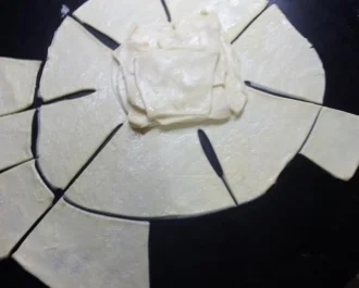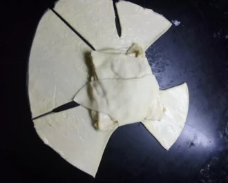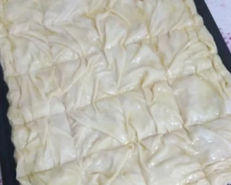 Βουτυρώνουμε το φύλλο και διπλώνουμε τα κομμάτια το ένα πάνω στο άλλο.