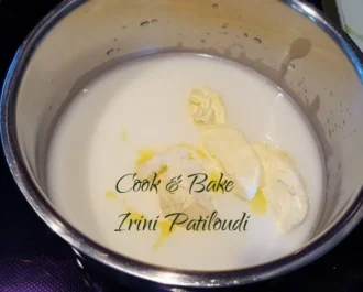 Σε ένα κατσαρολάκι βάζουμε το γάλα το νερό την ζάχαρη το αλάτι και το βούτυρο.